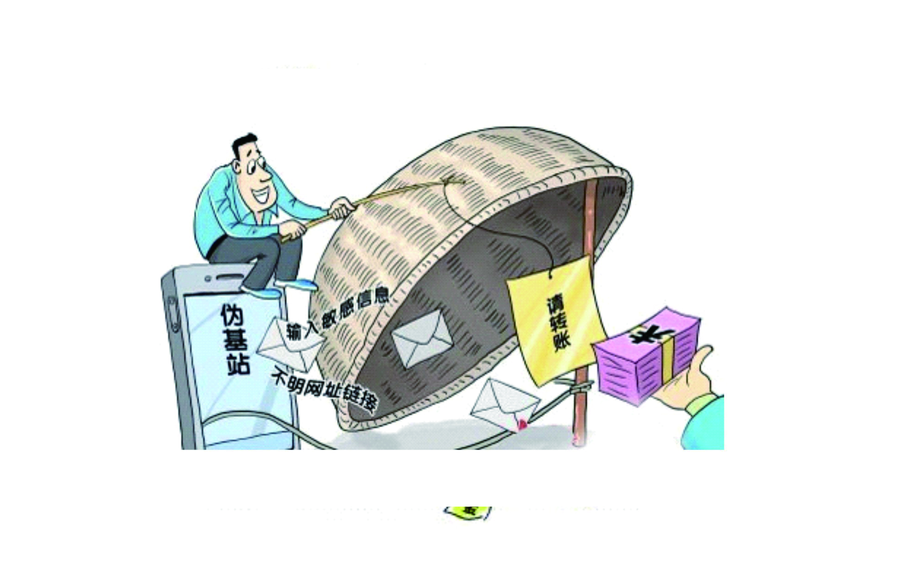 伪基站诈骗--利用伪基站发送假冒银行或运营商的诈骗短信,引诱用户点击链接下载木马病毒,盗取账号、密码等敏感信息,进而实施诈骗。
